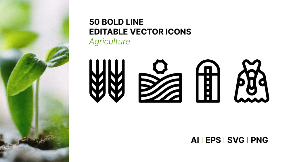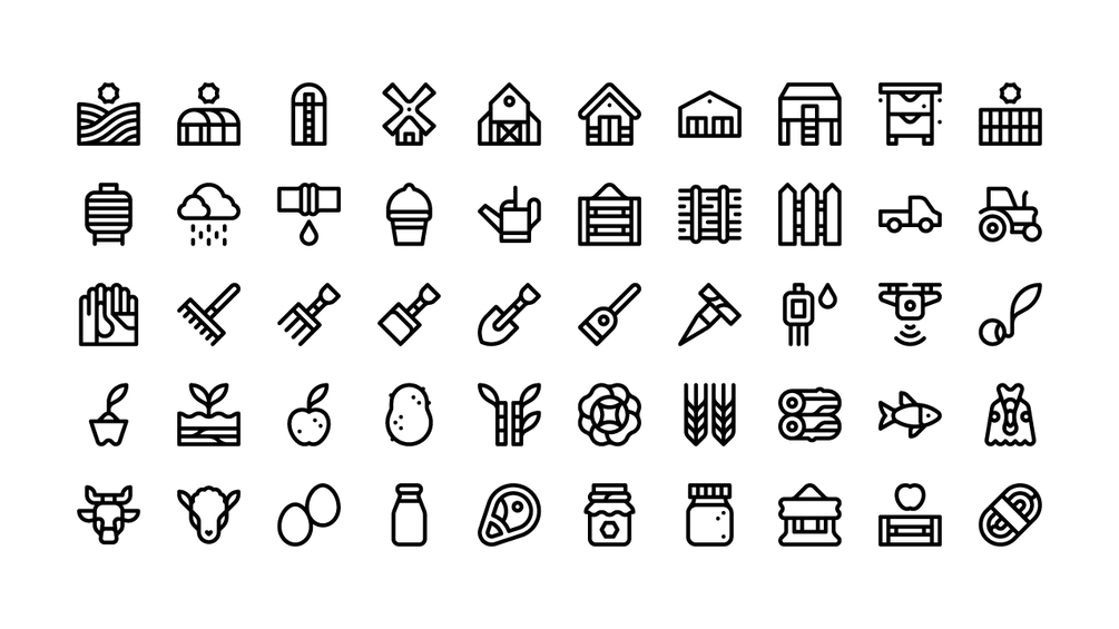 The concepts included in this icon library are: agricultural field, greenhouse, silo, windmill, farm, storage shed, cowshed, chicken coop, apiary, solar panel, water tank, rain, drip irrigation, bucket, watering can, compost bin, hay, fence, farm truck, tractor, gloves, rake, fork, spade, shovel, hoe, dibber, soil sensor, agricultural drone, seed, seedling, soil, apple, potato, sugarcane, cabbage, cereals, forestry, fish, chicken, cow, sheep, eggs, milk, meat, honey, jam, flour, produce, and wool.