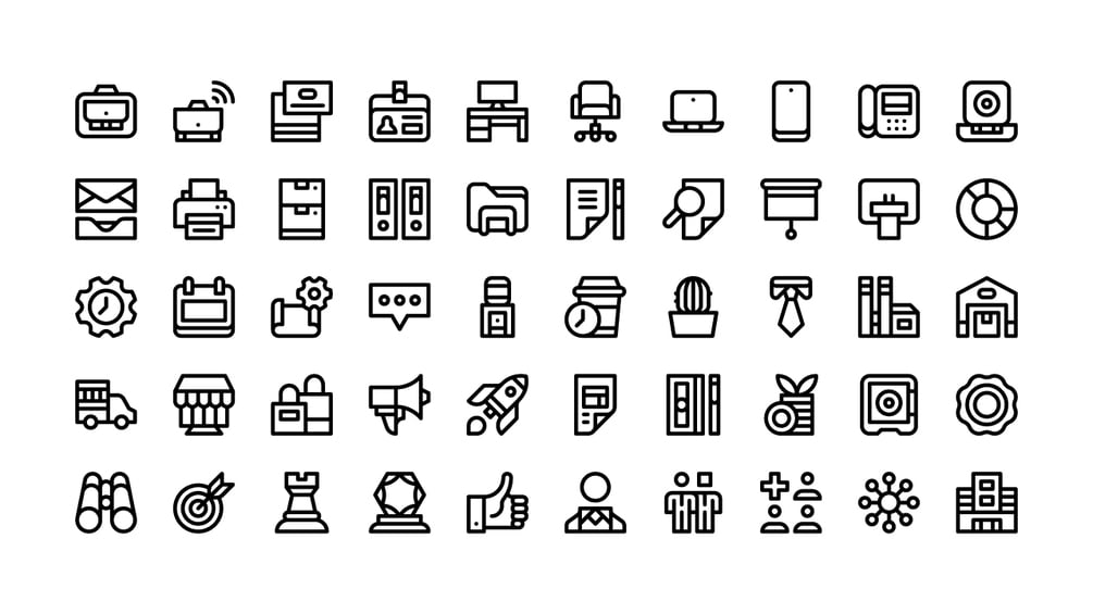 The concepts included in this icon library are: briefcase, remote work, business card, employee ID, desk, office chair, laptop, smartphone, landline phone, webcam, inbox, printer, filing cabinet, binders, folder, document, document review, presentation, conference, pie chart, time management, deadline, project management, feedback, water cooler, coffee break, cactus, dress code, industry, warehouse, delivery, shop, sales, marketing, launch, invoice, budget, investment, savings, quality, vision, goals, strategy, award, thumbs up, businessperson, workplace diversity, onboarding, network, and office building.