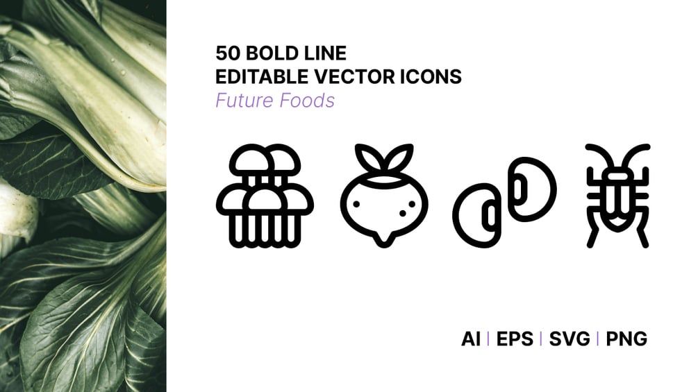 This is a collection of 50 future foods icons. Simple and bold. Feast your eyes on the future!