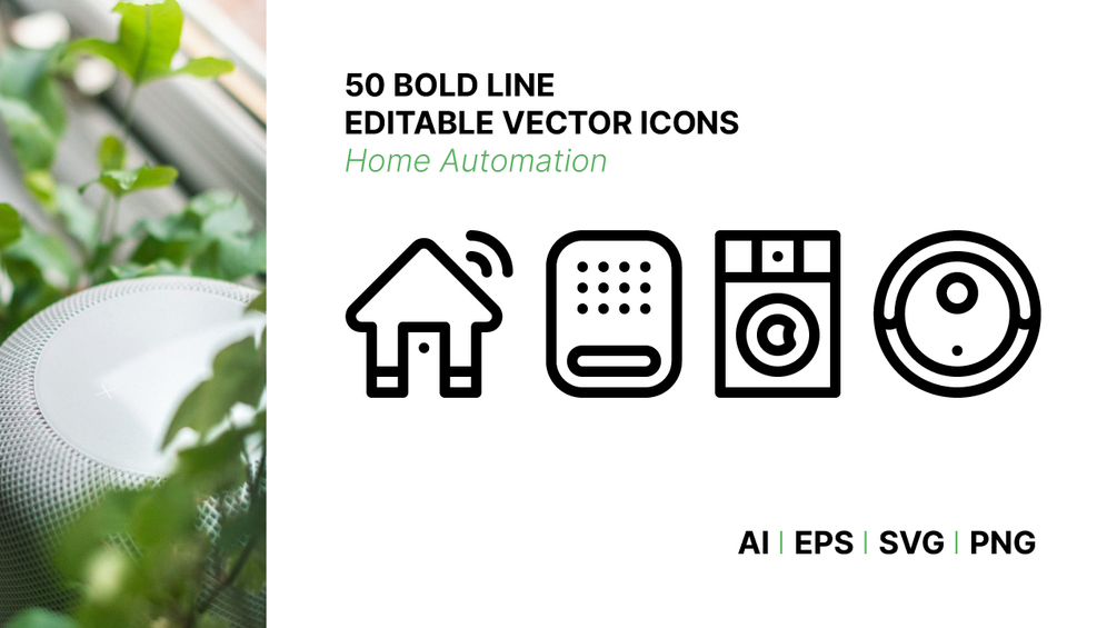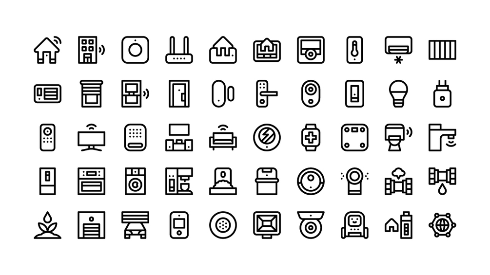 The concepts included in this icon library are: smart home, building automation, smart home hub, router, smartphone home control, smart home control panel, room control unit, temperature sensor, air conditioning, wall mounted heater, smart vent, smart blinds, smart window, door, door window sensor, smart lock, smart doorbell, smart switch, smart light bulb, smart plug, remote control, smart TV, smart speaker, home entertainment system, smart sofa, smart mirror, health monitoring, smart scale, smart toilet, smart faucet, smart fridge, smart oven, smart washing machine, smart coffee maker, smart pet feeder, smart bin, smart vacuum cleaner, air purifier, gas leak detection, leak detection, smart irrigation, garage, garage door, motion detector, siren alarm, smart security light, surveillance camera, care robot, energy efficiency, and internet of things.