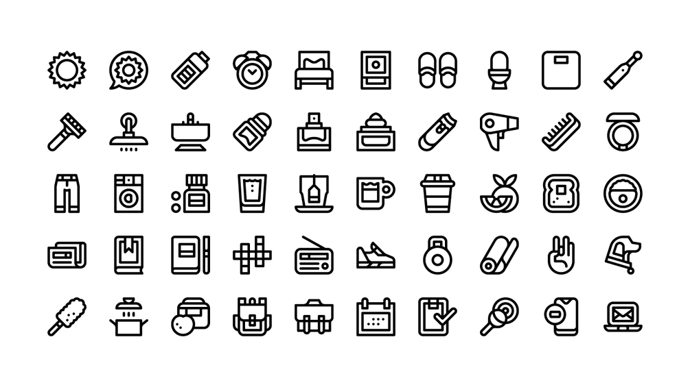 This is a collection of 50 morning routine icons. Simple and bold.