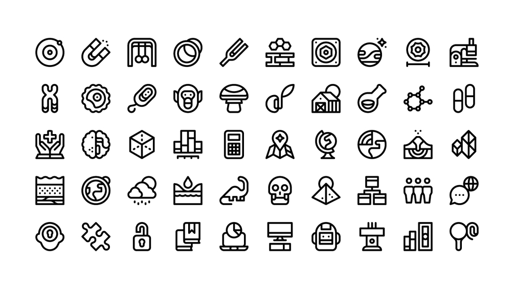 The concepts included in this icon library are: atomic physics, electromagnetism, mechanics, optics, acoustics, materials science, technology, astronomy, astrometry, histology, genetics, cellular biology, microbiology, zoology, mycology, botany, agricultural science, chemistry, organic chemistry, pharmacology, medical science, neuroscience, geometry, statistics, calculus, cartography, geography, geology, volcanology, mineralogy, soil science, environmental science, meteorology, hydrology, palaeontology, anthropology, archaeology, systems science, sociology, linguistics, psychology, logic, cryptography, library and information science, data science, computer science, robotics, political science, economics, and criminology.