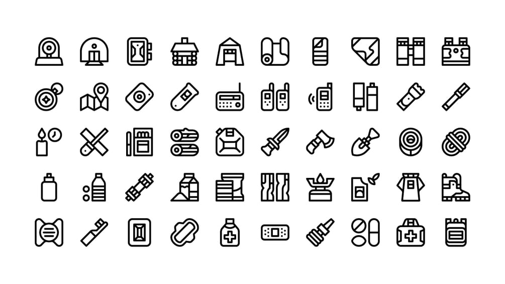 The concepts included in this icon library are: alarm light, bunker, bunker door, bug-out cabin, tent, sleeping mat, sleeping bag, emergency blanket, binoculars, night vision binoculars, compass, map, signal mirror, emergency whistle, radio, walkie-talkie, satellite phone, batteries, torch, flare, emergency candle, fire steel, matches, firewood, fuel, knife, hatchet, survival shovel, duct tape, rope, water bottle, purification tablets, survival water filter, dried milk, food rations, beef jerky, camping cooker, seeds, rain poncho, hiking boots, dust mask, toothbrush, soap, menstrual pad, rubbing alcohol, plaster, haemostatic powder, medicine, first aid kit, and backpack.