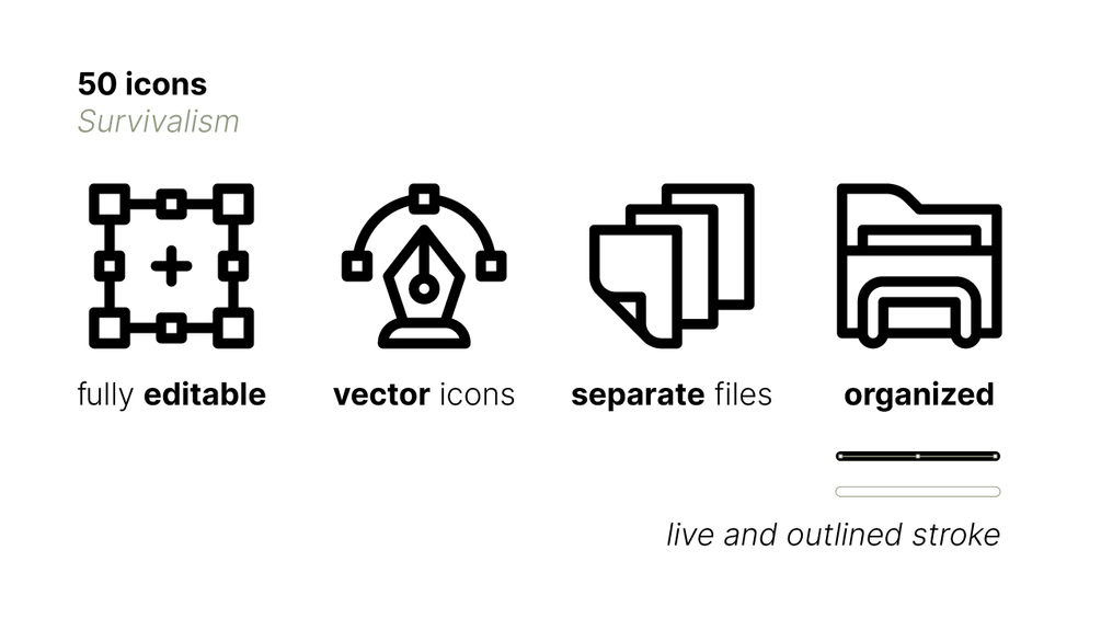 • 50 live stroke icons. Each icon grouped on its own artboard and layer (1 AI file, 1 EPS file)