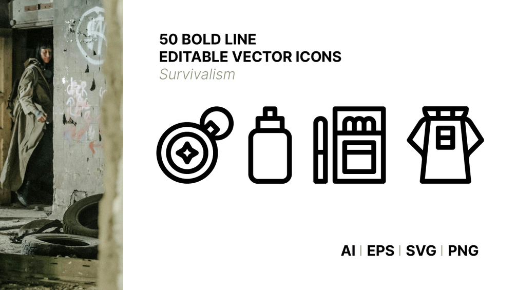 This is a collection of 50 survivalism icons. Simple and bold. Gear up for the apocalypse!